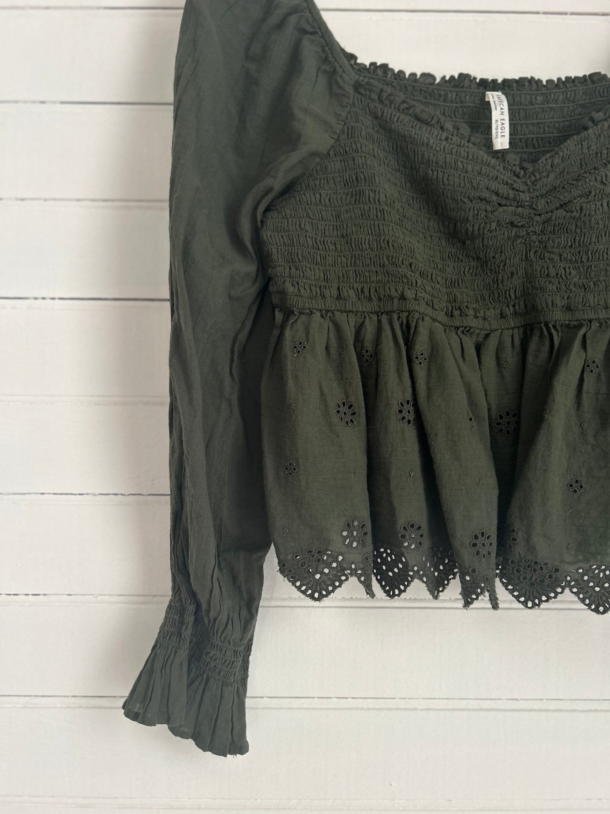 American Eagle green cropped longsleeve shirt with rouching on bust and sleeves and eyelet details around the hem. 100% cotton.