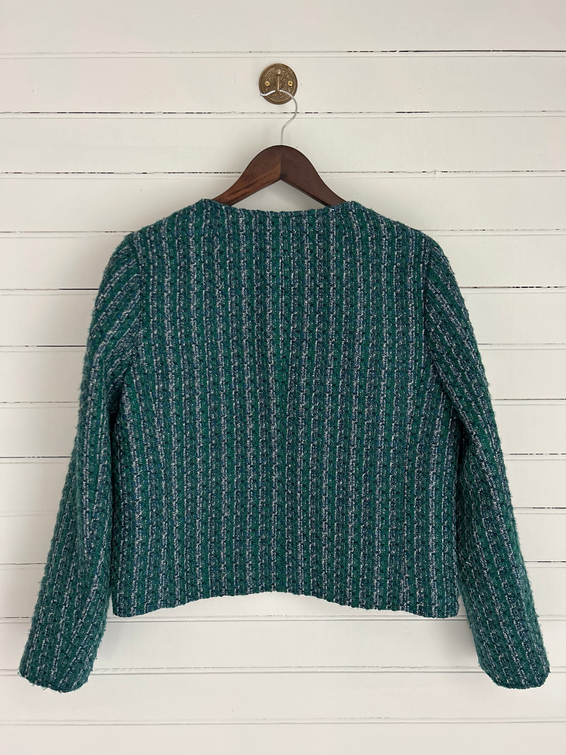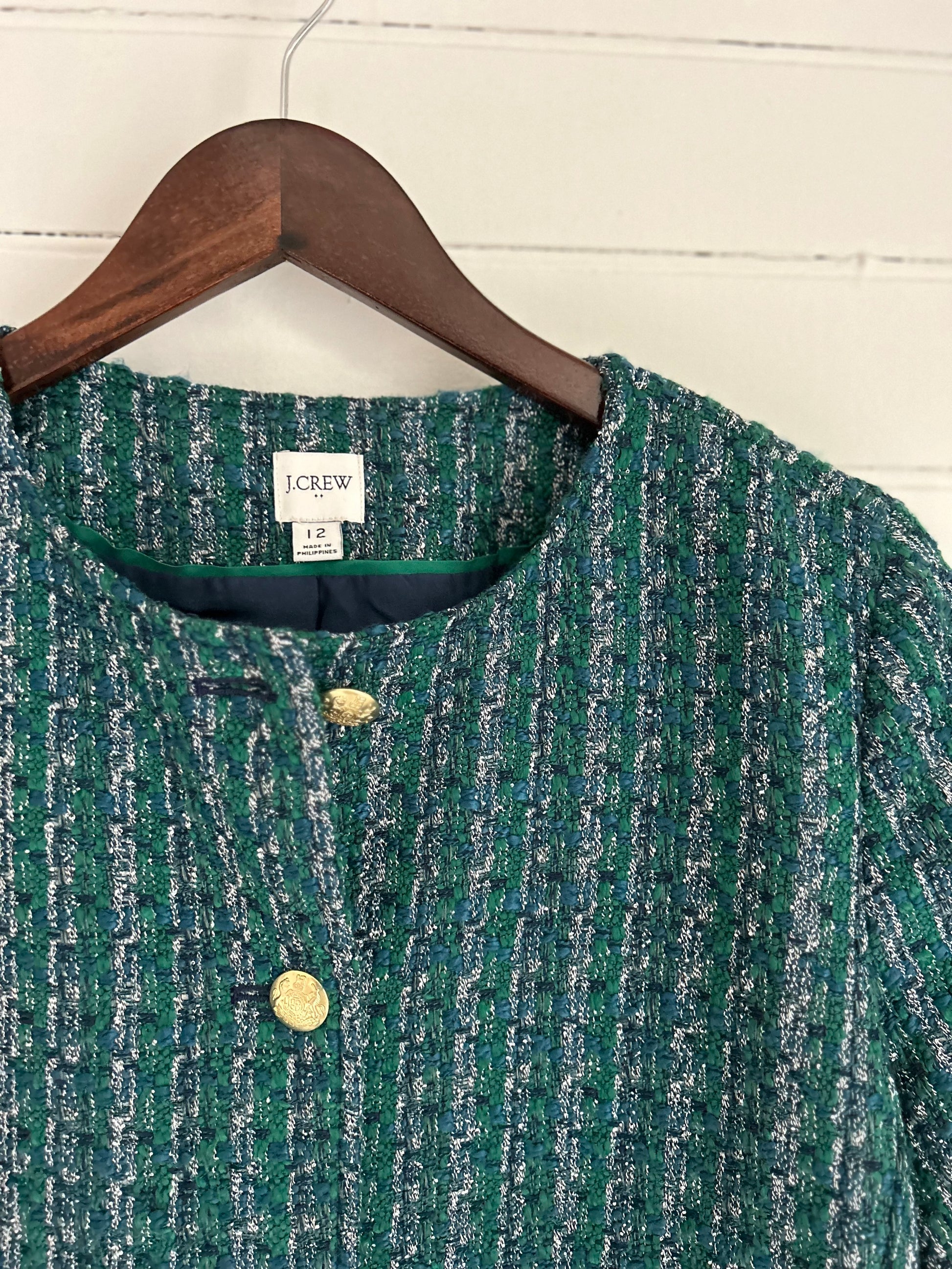 J. Crew green tweed jacket with gold buttons and two big pockets.