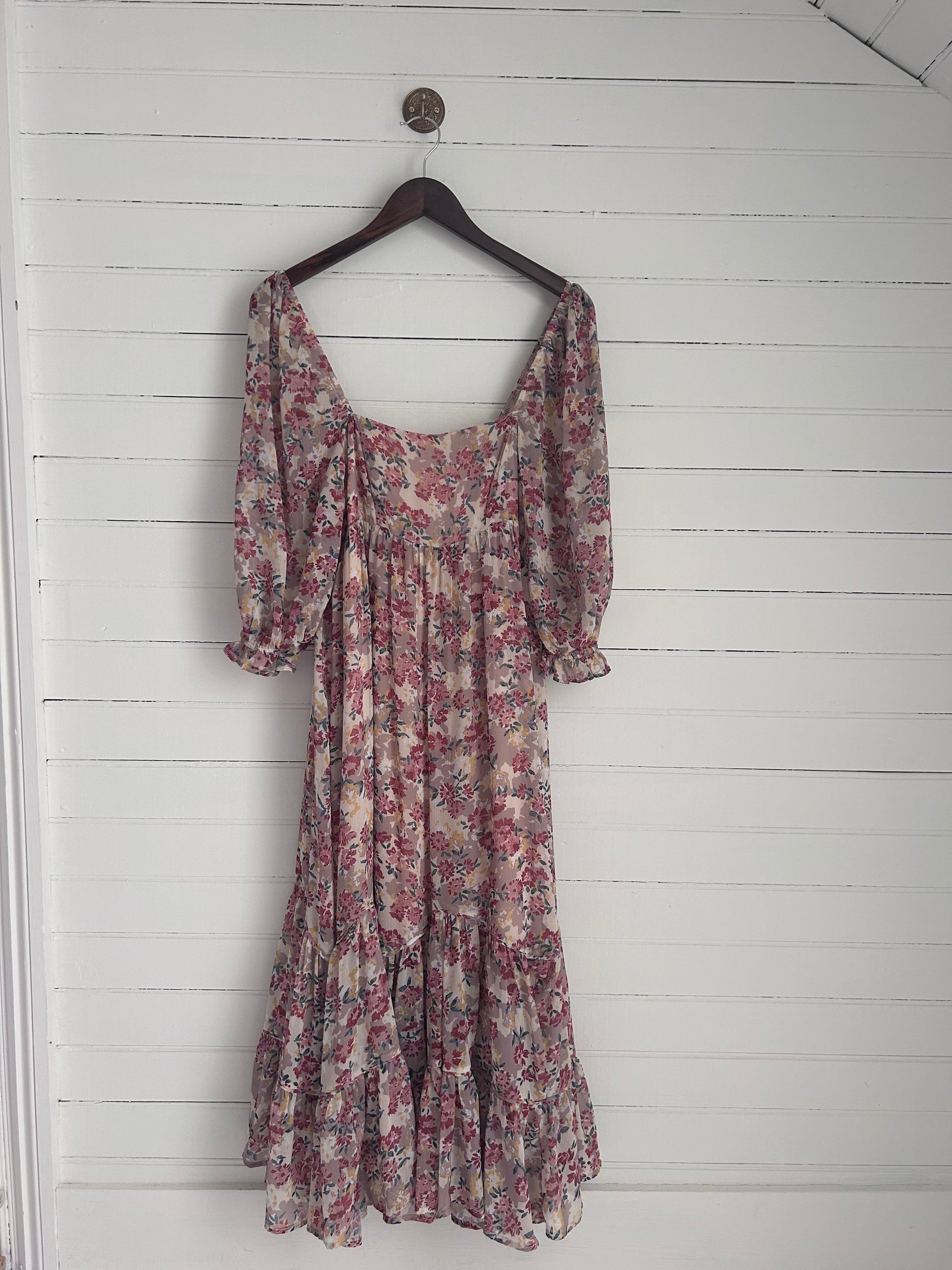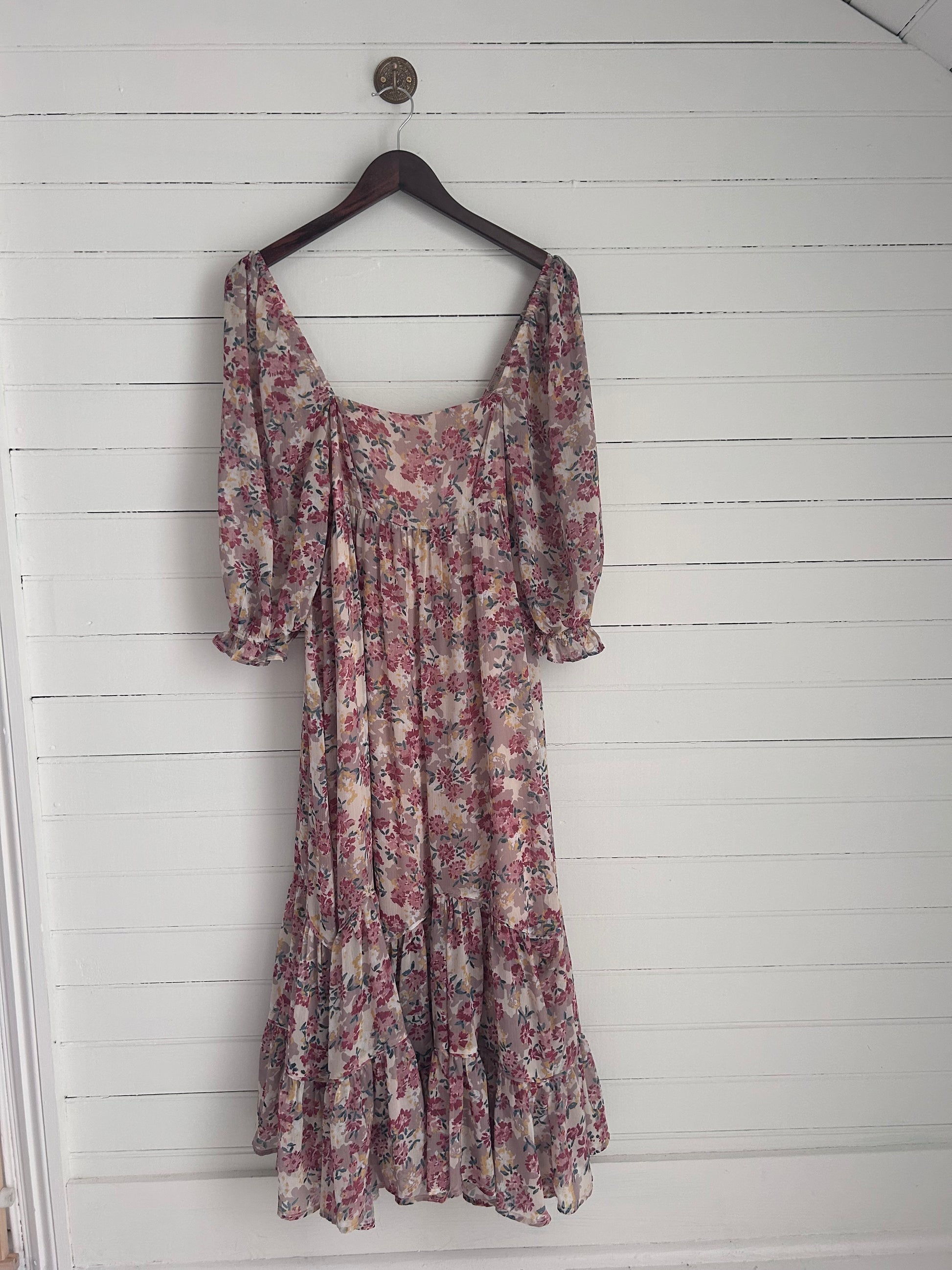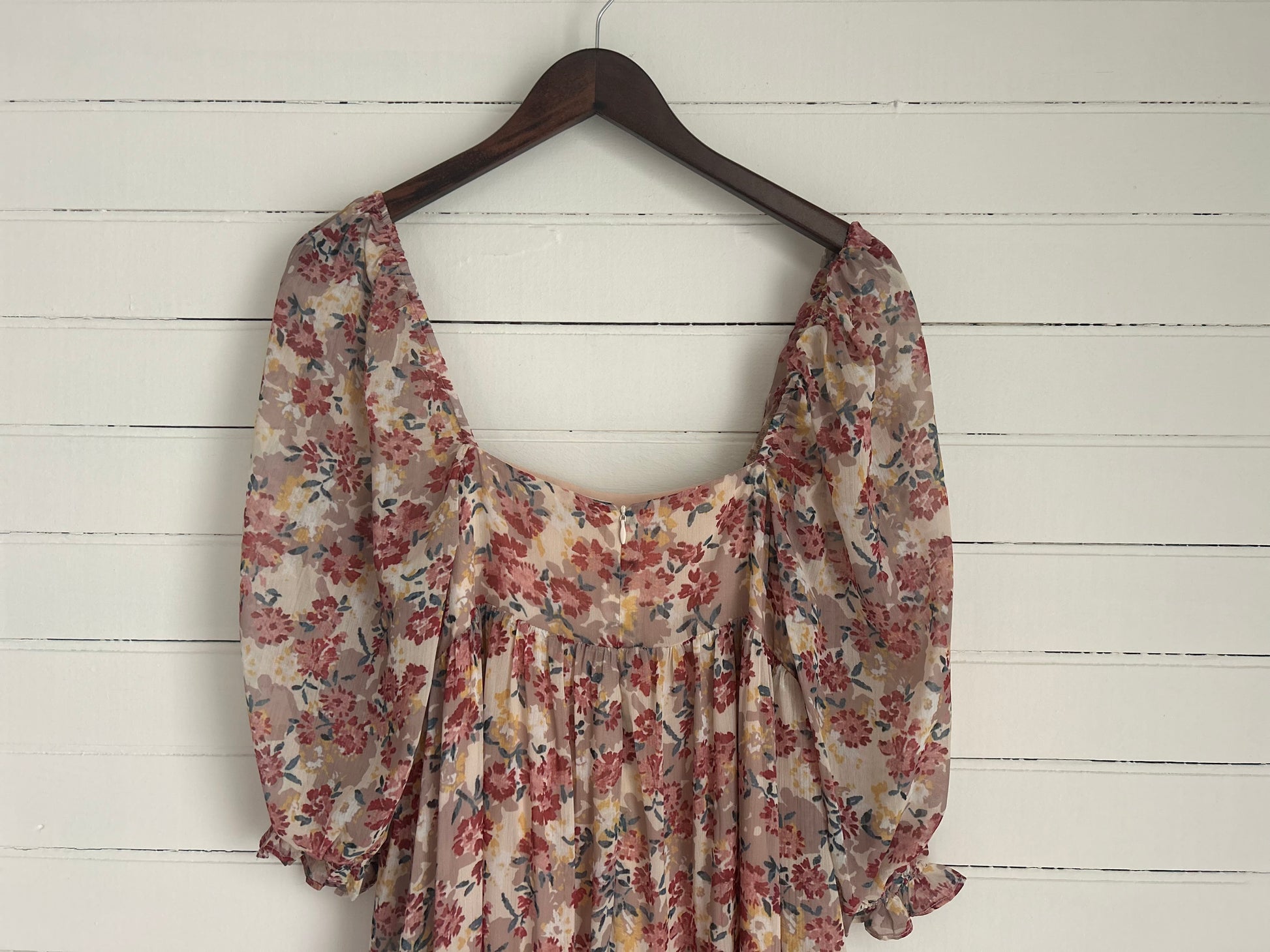 Fab'rik cream dress with blue, red, and yellow flower details. Double lined with tiers at the bottom. Zipper in the back and elastic around the sleeves. Can be worn off the shoulder or on.