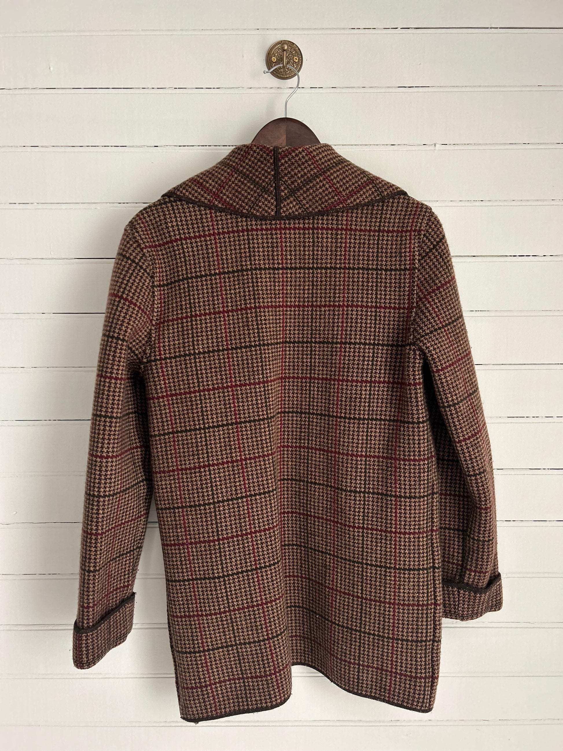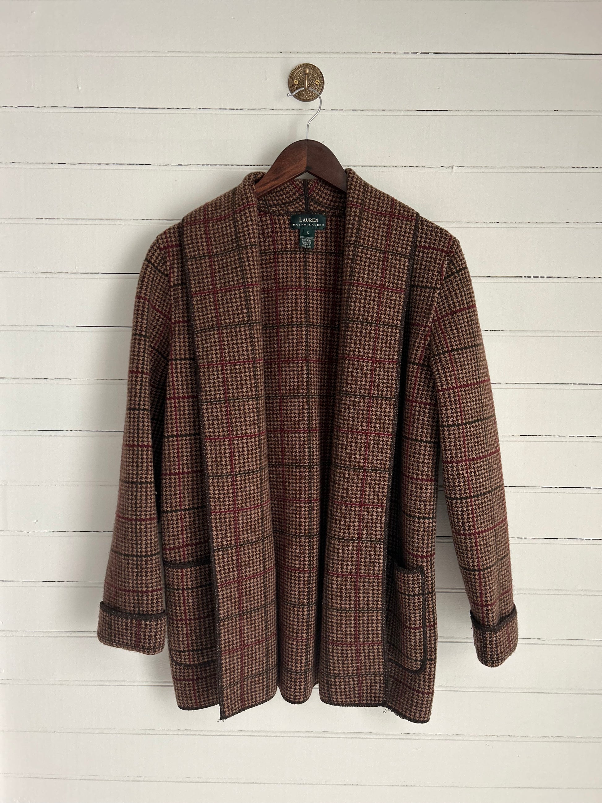 Ralph Lauren brown plaid overcoat with red stripes throughout. 100% lambswool with cuffed sleeves.
