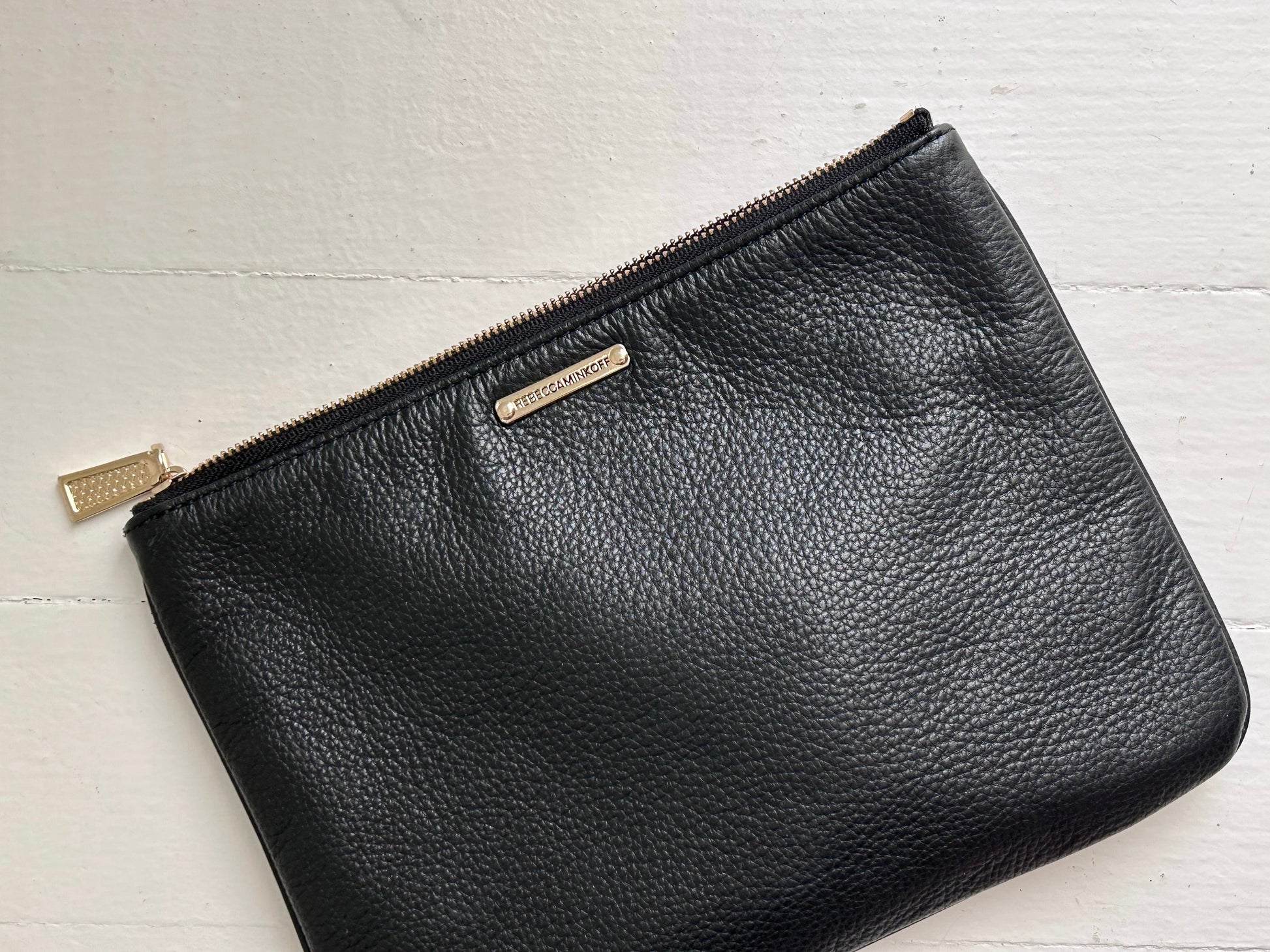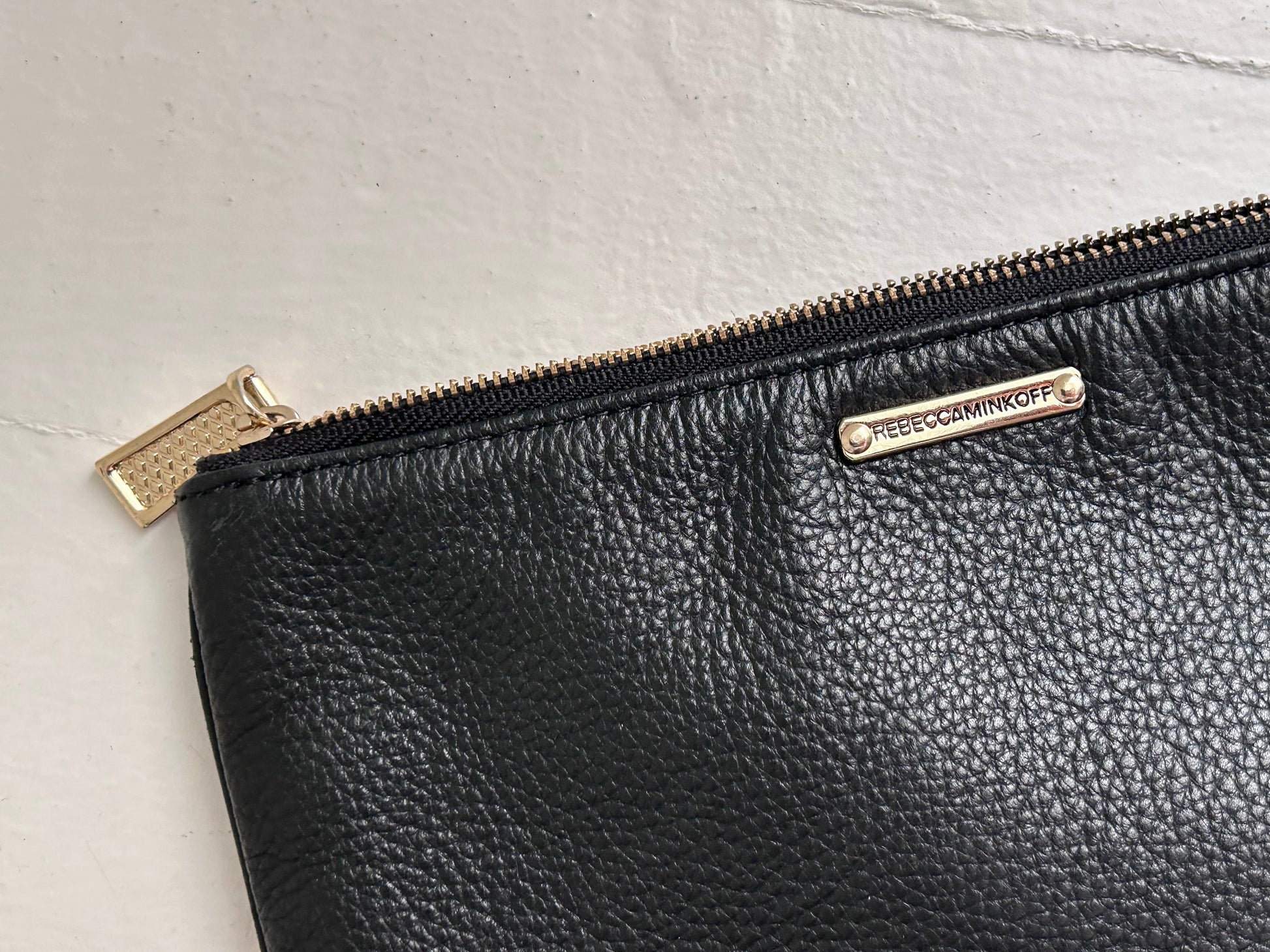 Rebecca Minkoff black leather handbag with no strap. Gold zipper at the top.